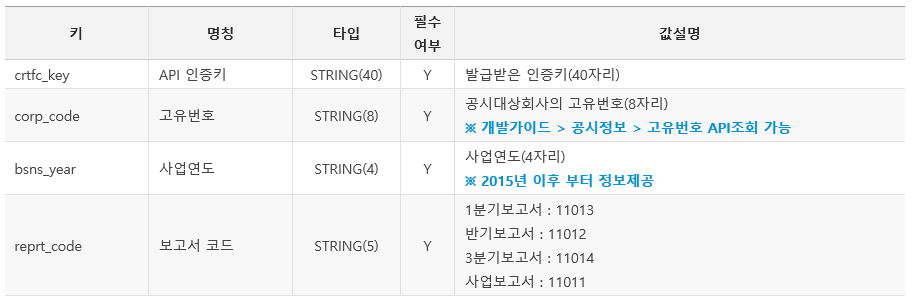 DART에서 제공하는 API를 이용하여 재무제표를 요청하기 위해선 아래와 같은 정보가 필요하다.